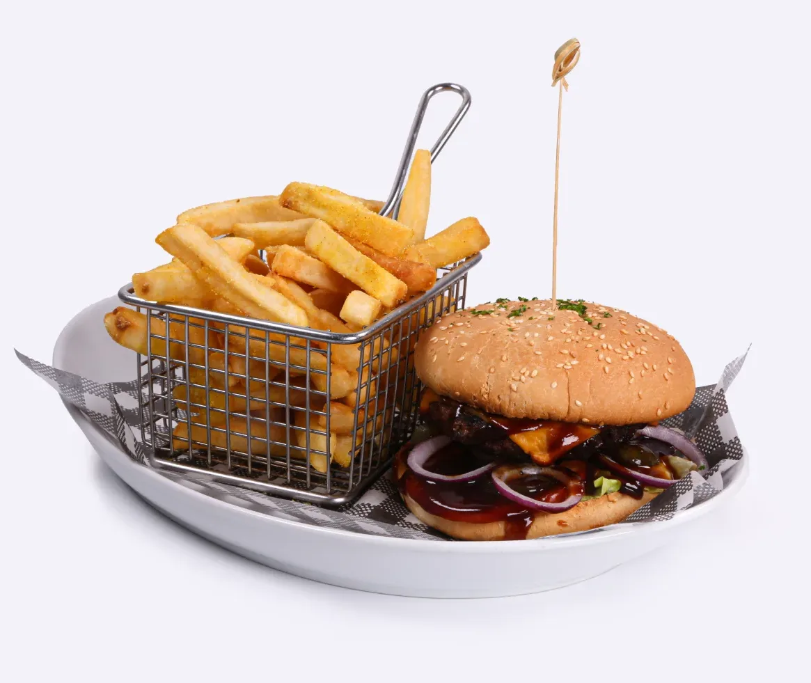 Juicy Angus beef burger served in a soft bun, topped with fresh lettuce, tomato, and cheese, paired with golden crispy chips for the perfect comfort meal.
