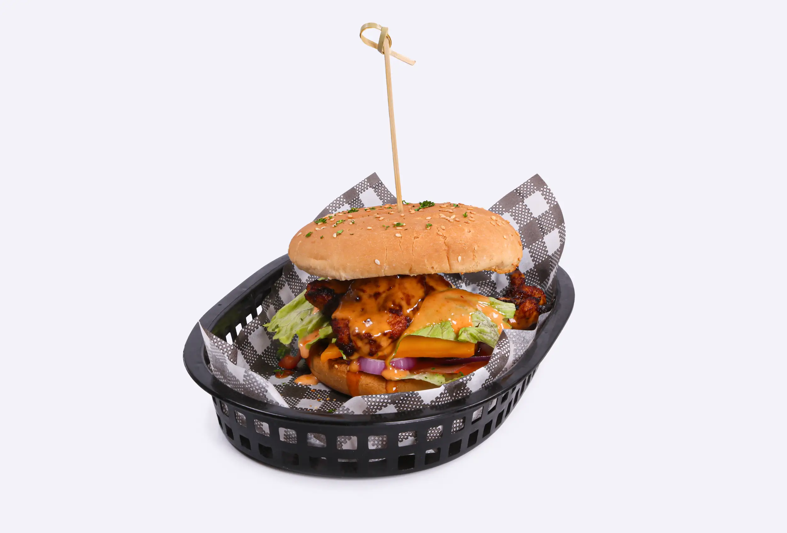 Juicy, tender chicken patty grilled to perfection, topped with fresh lettuce, ripe tomatoes, and creamy mayo, all sandwiched in a soft, lightly toasted bun.
