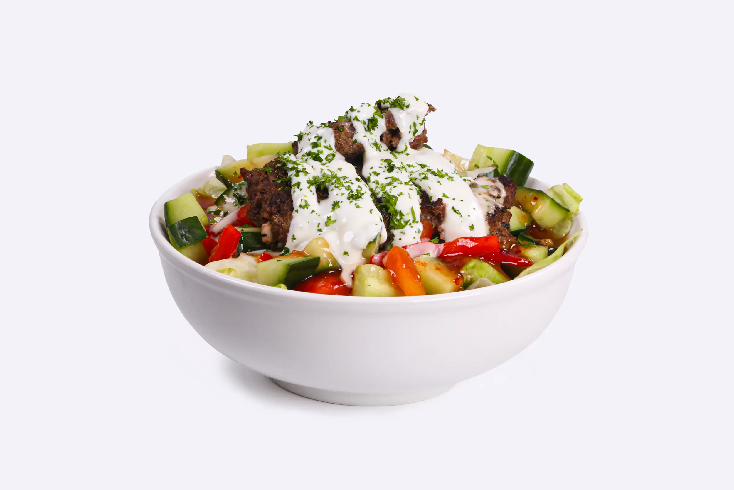 Your choice of protein atop Fattoush salad with garlic aioli.