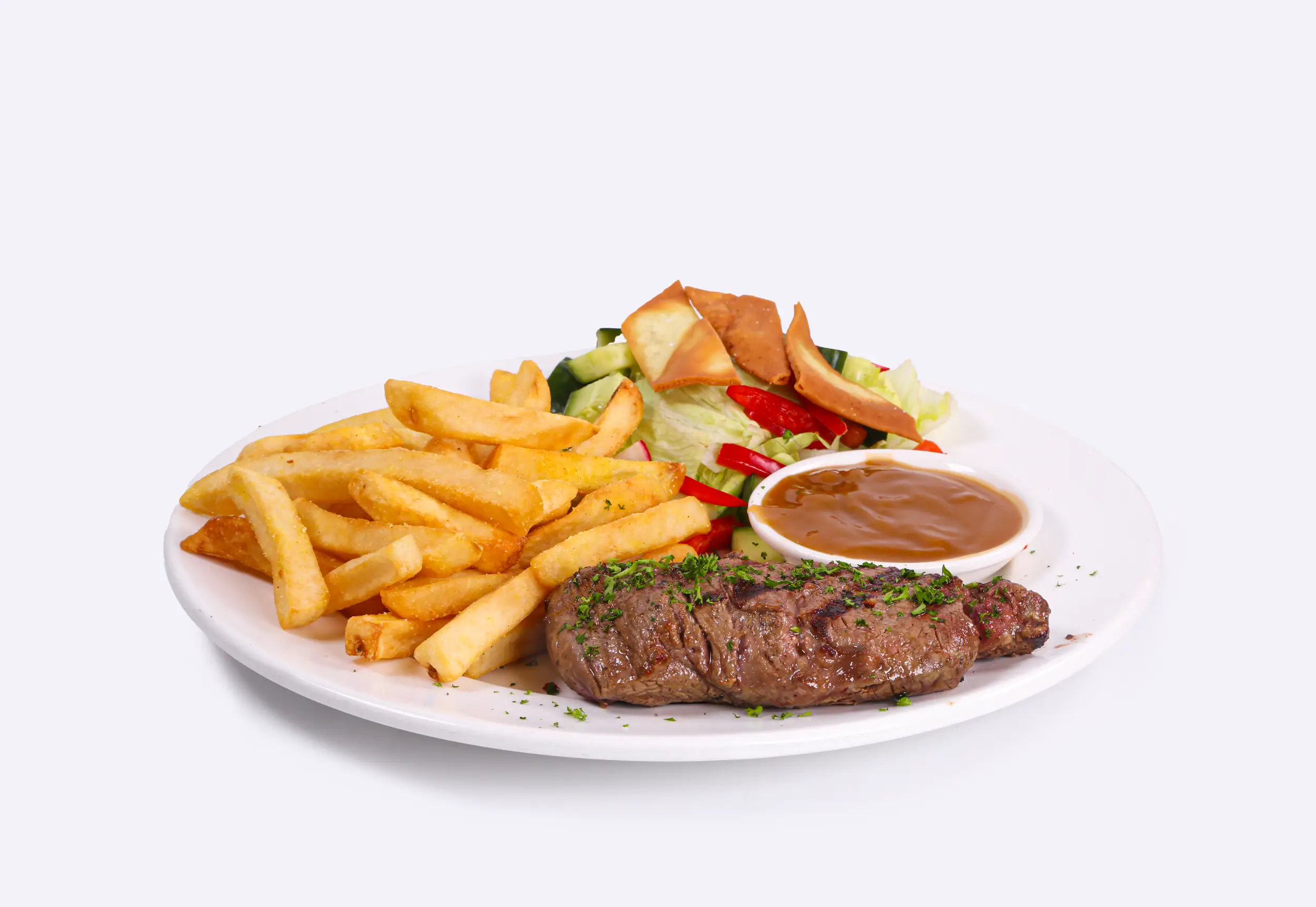 Served with chips, Fattoush salad, and choice of mushroom, pepper, or gravy.